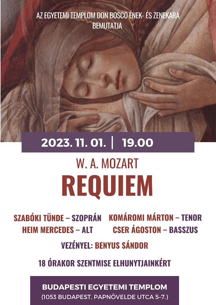 Mozart: Requiem. Templomunk Don Bosco ének- és zenekara november 1-én, szerdán, az esti szentmise után 19:00 órakor előadja Mozart Requiem c. művét. Szeretettel hívunk minden érdeklődőt. A belépés díjtalan. Meghívó plakátot és bővebb információt lásd lejjebb.